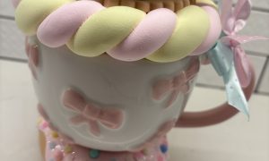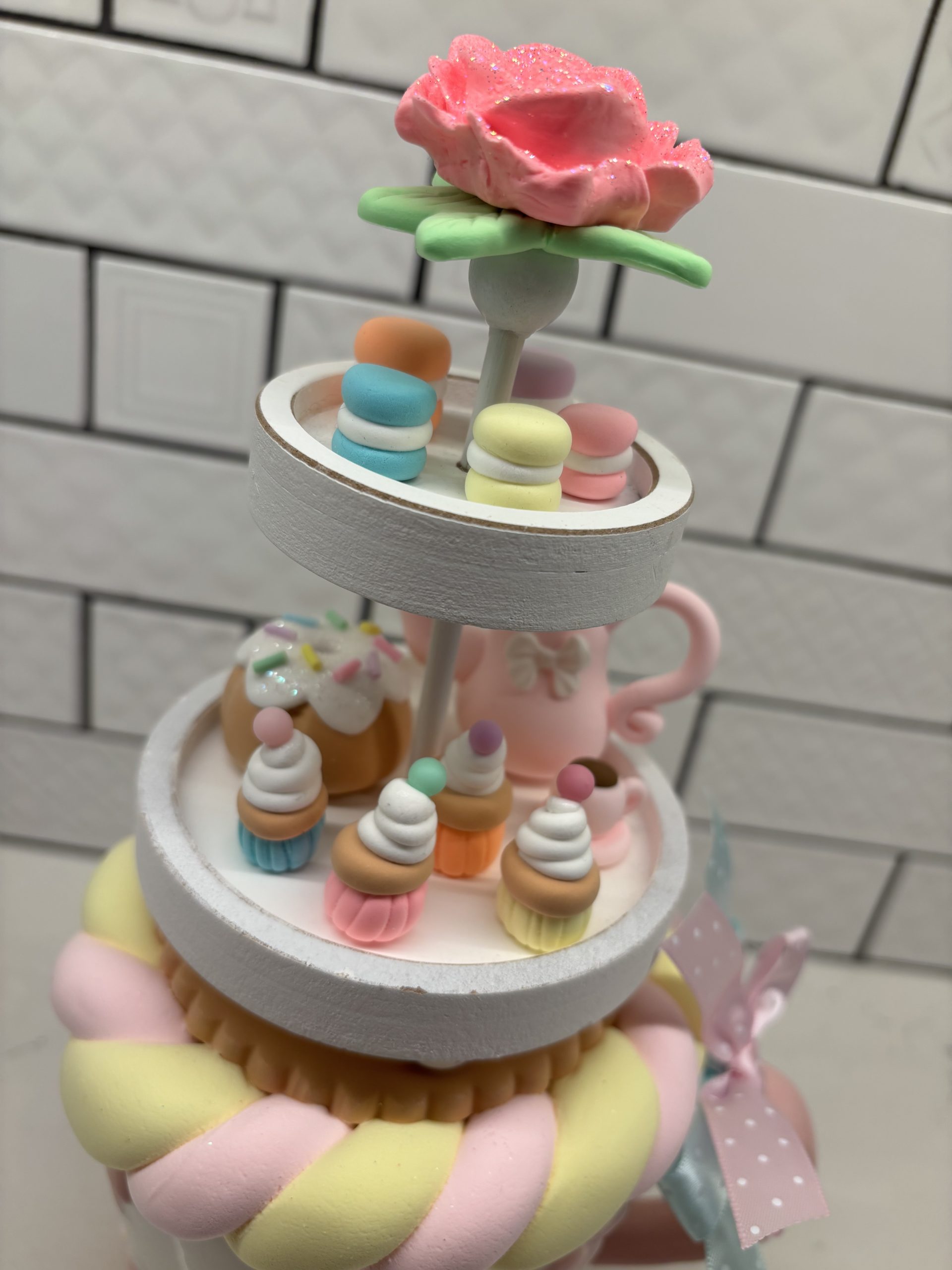 This oh-so-sweet mini tea party set complete with oversized doughnut stand, ceramic tea cup with bows, candy twist cookie, mini teapot and cup, 5 mini macarons, 4 mini cupcakes and a mini bundt cake, will be a fun addition to your home or party decor or give as a gift! This handmade with love treasure measures approximately 12″ x 7″.