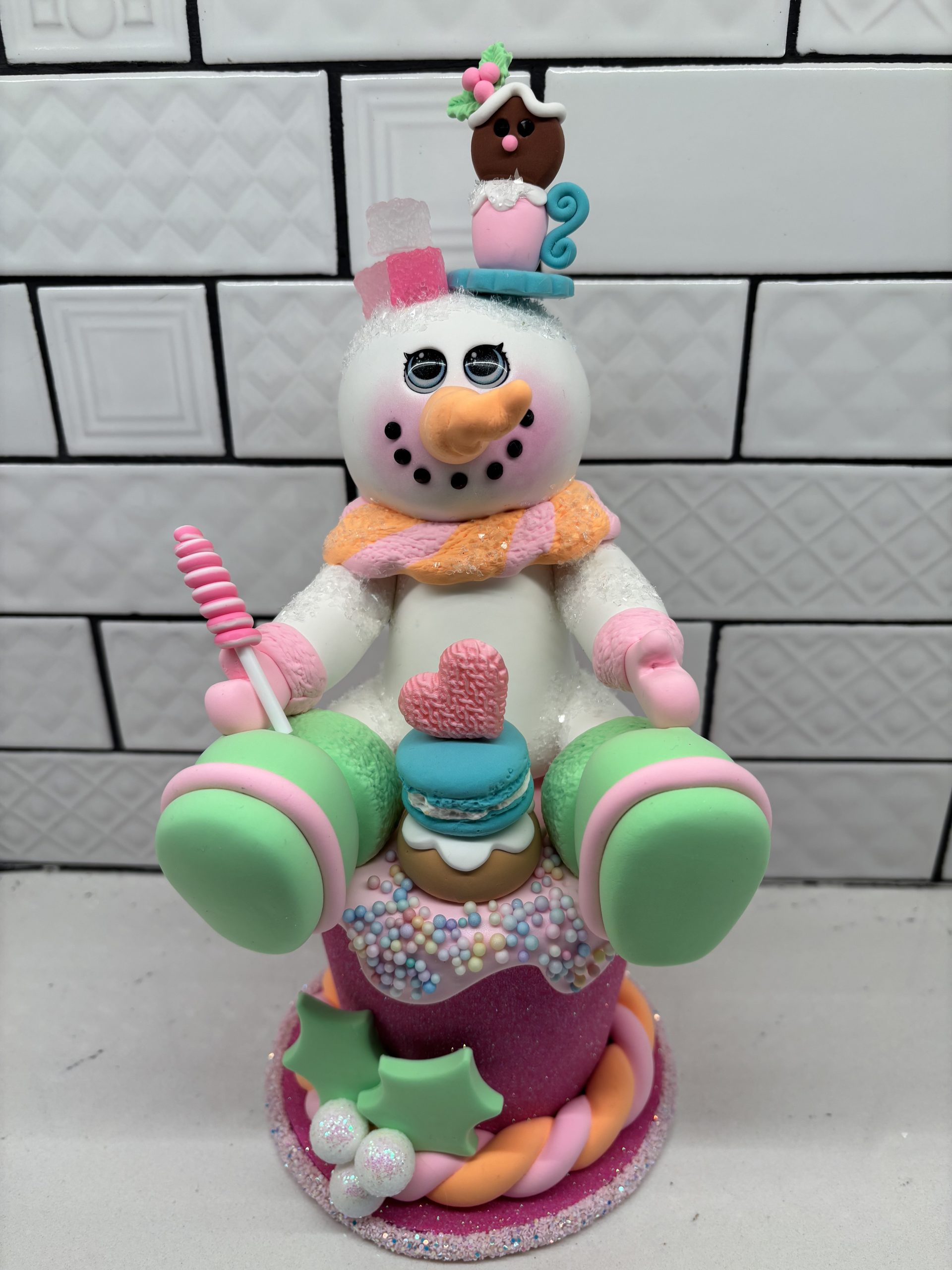 Flurry is hosting a winter tea party and she has invited her bestie, Gingersnap to the party! Flurry sits on top of a glittered hat adorned with peppermint twist, holly leaves & sparkle berries. Flurry has her mittens, shawl and snow boots on and has set the table with a doughnut & macaron cookie. Sweet little Gingersnap is peeking out of the cup of tea looking for the sugar cubes! Measures approximately 12″ x 6″ and is handmade with love!