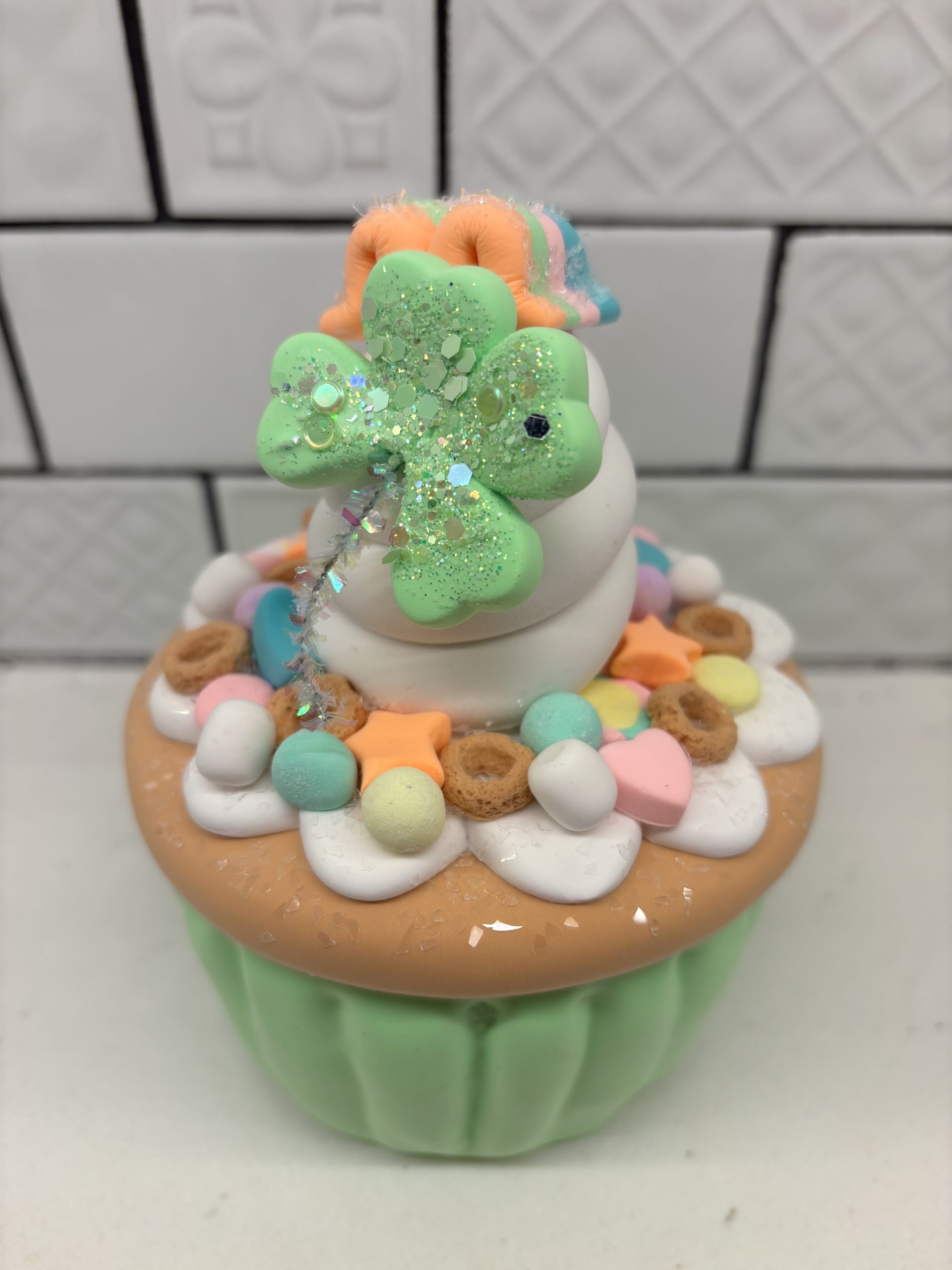 A cute oversized cupcake perfect for your tiered tray displays! Generously decorated with charms, cereal pieces, frosting, four-leaf clover, rainbow and diamond dust. Measures approximately 6″ x 4″ and is handmade with love!