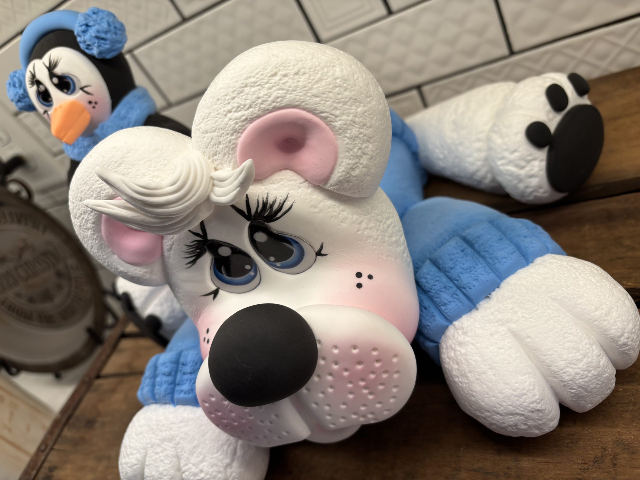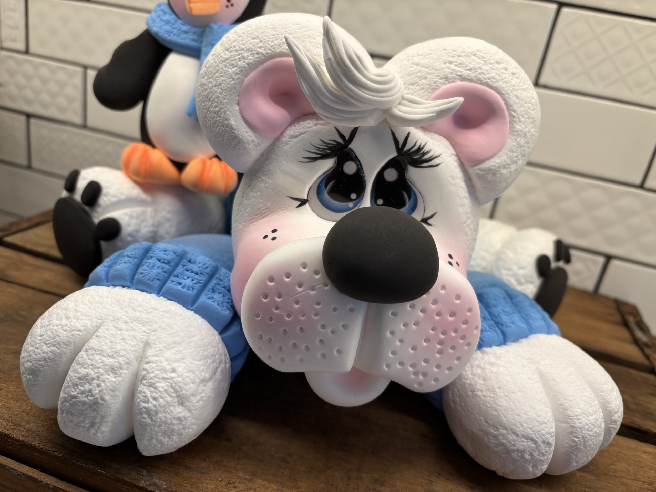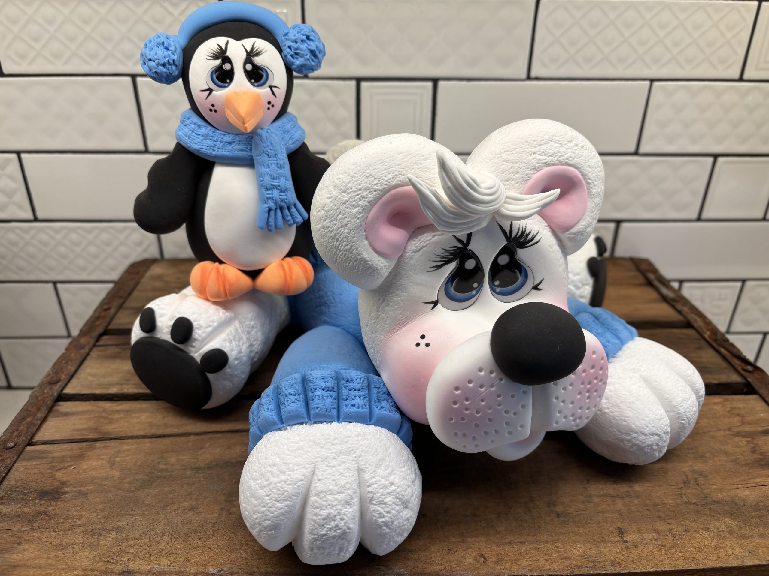 This little polar bear is sweet as can be with his blue sweater and Parker his bestie sitting on his back! Piper measures approximately 12″ x 8″ and Parker measures approximately 4″ x 3″. This item is handmade with love, so please allow 1 – 2 weeks for assembly and dry time.
